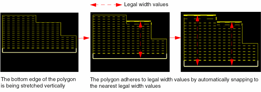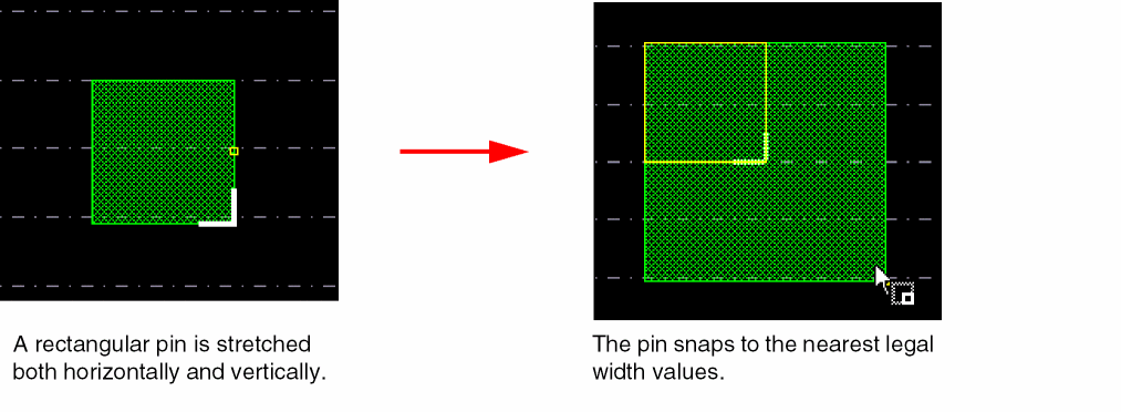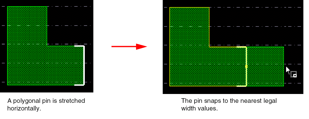 When a pin is created or stretched, it automatically snaps to the nearest legal width value using discrete dimension gravity.