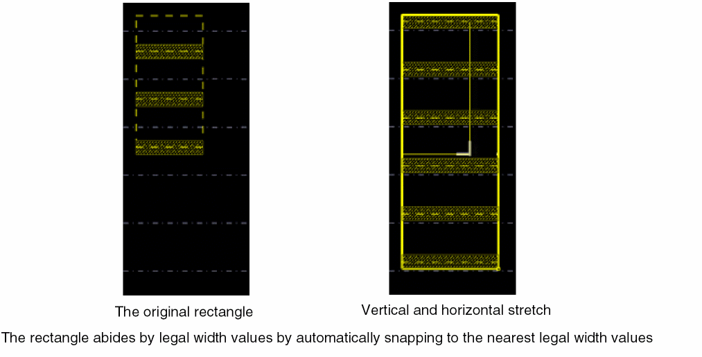 The following figure illustrates discrete dimension gravity during a two-direction rectangle stretch operation:
