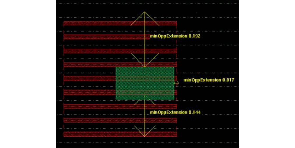 The minOppExtension constraint defines the total required enclosure between two opposite edges of overlapping shapes on two different layers. DRD uses the following parameters of this constraint to support discrete enclosure rules for FinFETs: