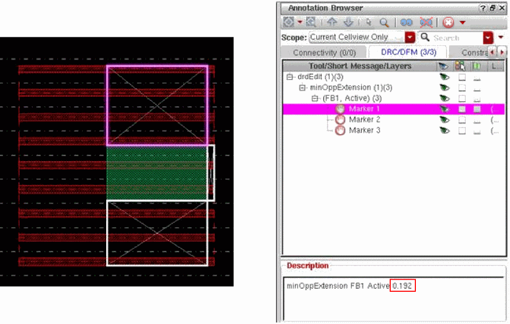 The following figure illustrates this example in DRD Post-Edit and Batch-Check modes. As shown in the Annotation Browser, DRD reports a minOppExtension violation (Marker 1) because the vertical enclosure between the rectangles on layers FB1 and Active does not conform to the nearest vertical legal enclosure value (0.192 user units).