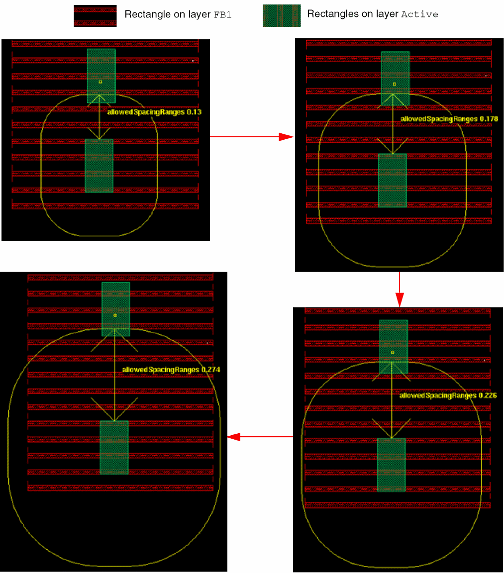 The allowedSpacingRanges constraint defines a set of legal spacing rules, in the form of ranges and discrete values, between shapes on the same layer or different layers. DRD uses the following parameters of this constraint to support discrete spacing rules for FinFETs: