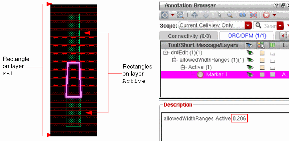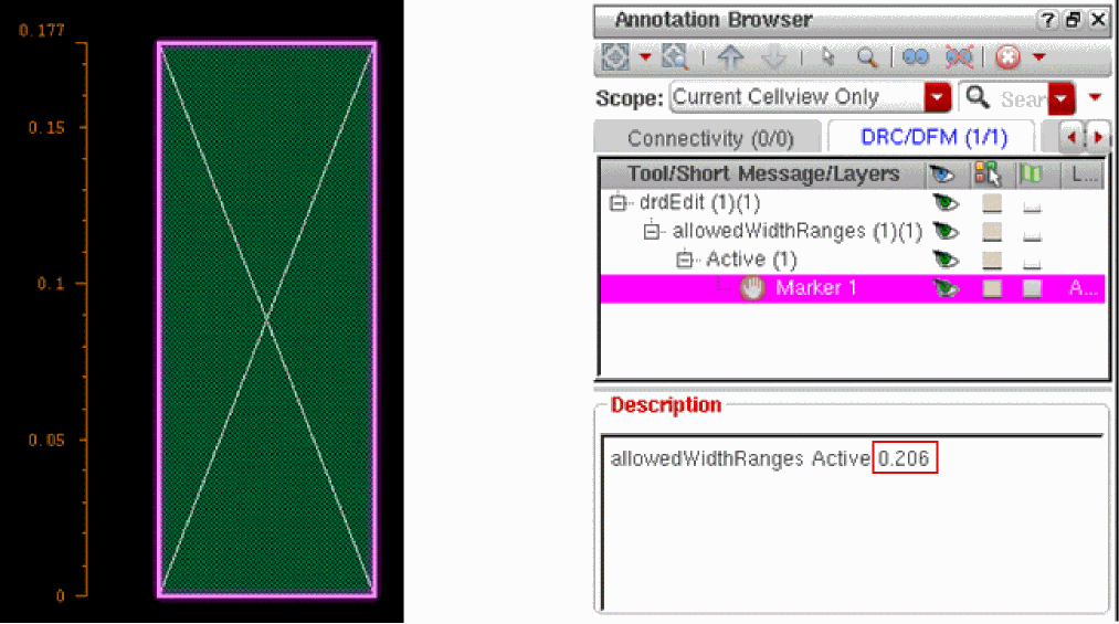 The following figure illustrates this example in DRD Post-Edit and Batch-Check modes. As shown in the Annotation Browser, DRD reports an allowedWidthRanges violation (Marker 1) because the vertical dimension of the rectangle does not conform to the nearest legal width value (0.206 user units).