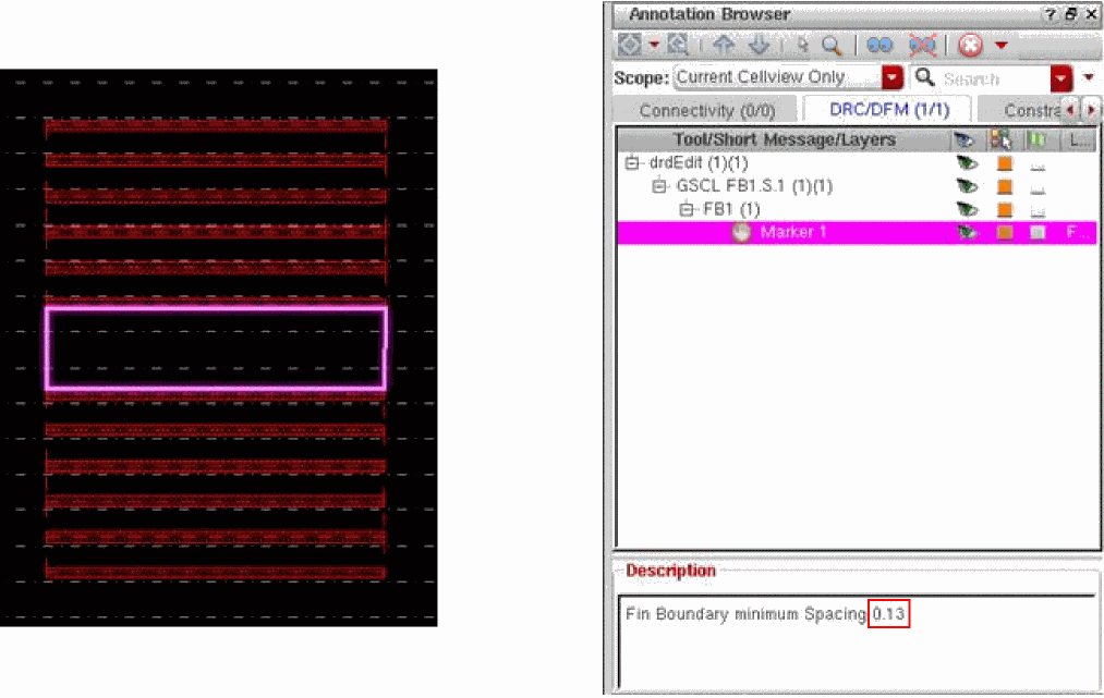The following figure illustrates this example in DRD Post-Edit and Batch-Check modes. As shown in the Annotation Browser, DRD reports a minSpacing violation (Marker 1) because the spacing between the fin boundaries does not meet the minimum legal spacing value (0.130 user units).