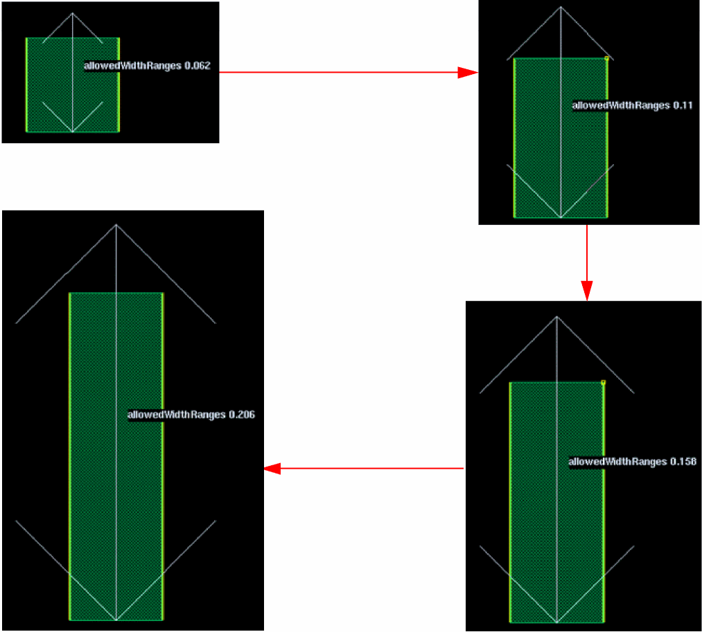 The following figures illustrate this example in DRD Notify mode. As the rectangle is stretched vertically, DRD displays arrows to indicate the incremental legal width values.