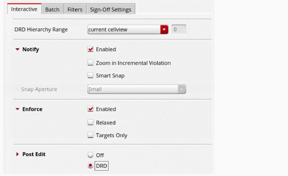 The Design Rule Driven (DRD) editing tool provides real-time dynamic DRC feedback to facilitate correct-by-construction layout design.You can use DRD editing to significantly reduce the number of design rule check (DRC) violations during layout editing. However, the features provided through DRD are not a replacement for physical verification tools such as Pegasus or PVS.