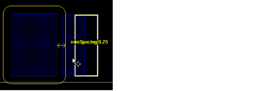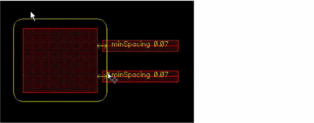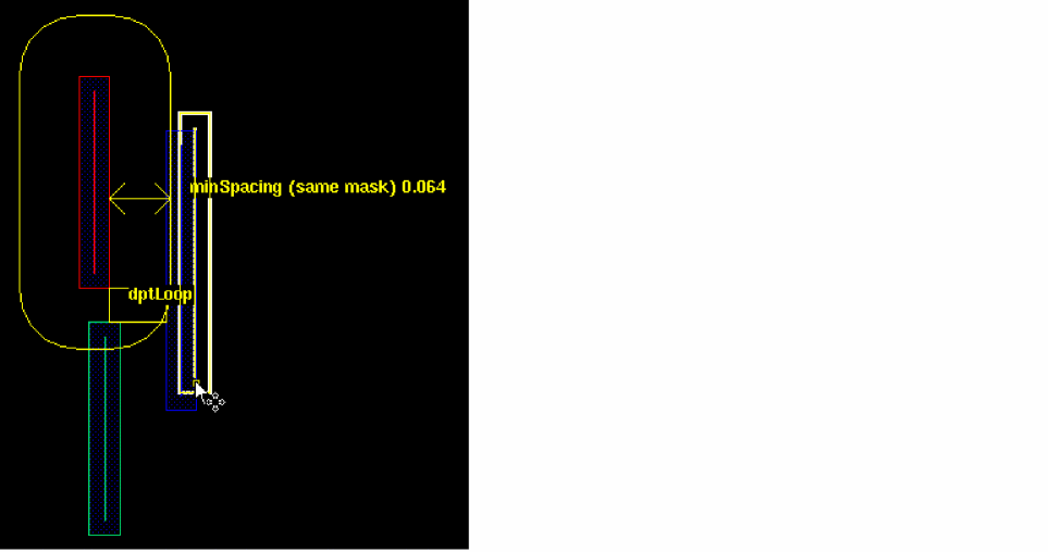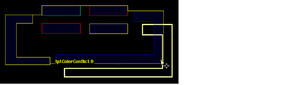 Colorability: Colorability check is performed to determine if a set of shapes is colorable without any color rule violation in an MPT environment. This check does not look for actual color of the shapes. If a set of shapes fails colorability check, those shapes cannot be colored using a certain number colors. In case of a Double Patterning Technology (DPT) environment, the set of shapes needs to be colored using two colors; in case of a Triple Patterning Technology (TPT) environment, the number of colors would be three. See multiMaskCheck in Virtuoso Technology Data Constraints Reference.Colorability checks are available only in DRD Notify, Post Edit, and Batch modes, and they can be performed only when the Spacing and Complex Spacing constraint groups are selected on the Filters tab of the DRC Options Form form.The figure below shows a double patterning loop violation: