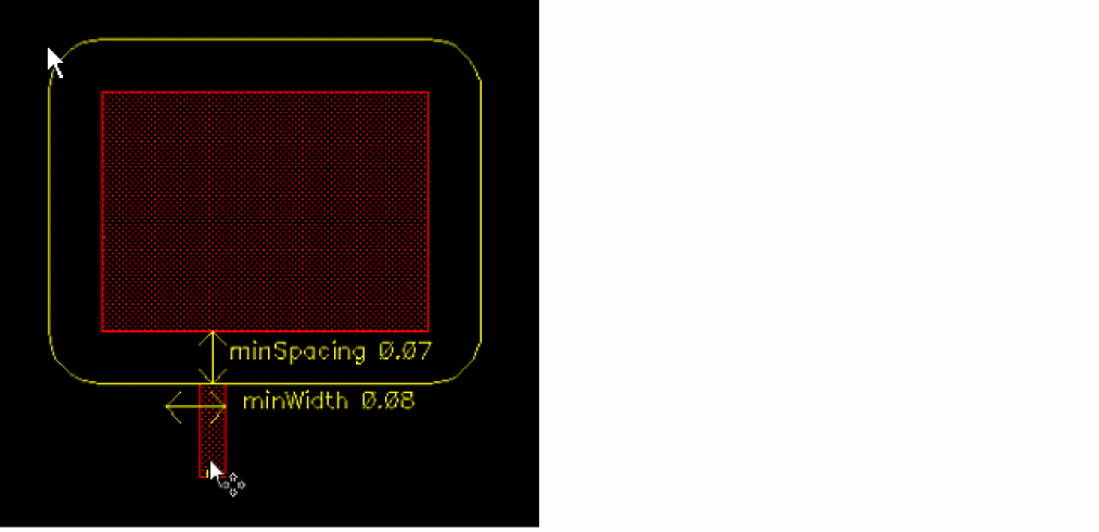 In Notify mode, the tool provides visual feedback (text, edges, halos, or arrows) when the specified design check rules are violated. However, the pointer is not constrained or halted, allowing you to create objects with design violations. If you create an object with design violations, the visual feedback about the violation disappears. To retain an indication of the design violation, you can turn on Post Edit mode. See,Using Post Edit Mode.