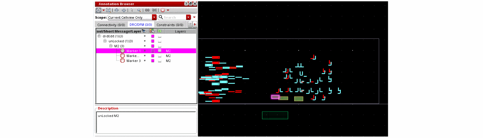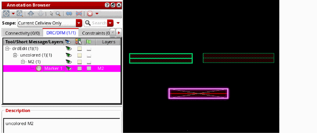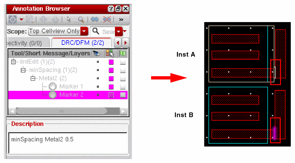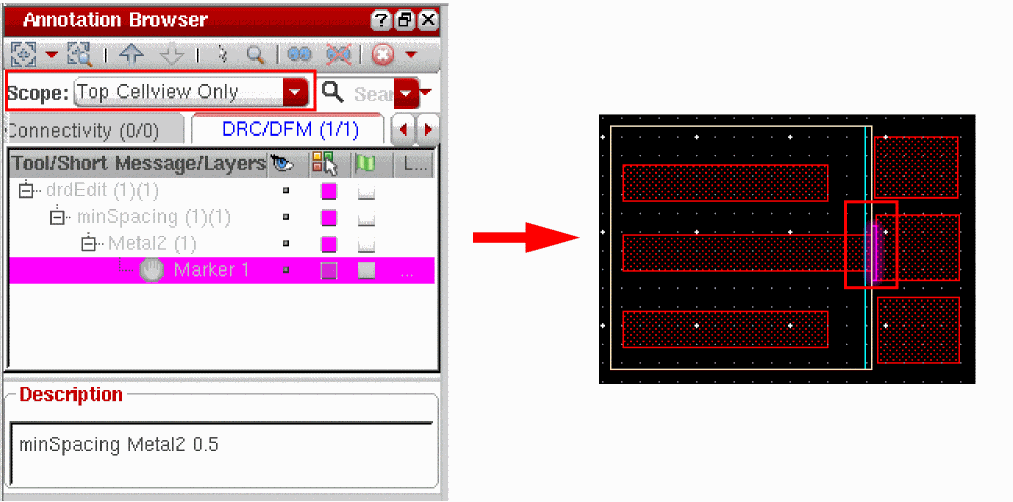 To view the post edit markers, choose Scope as Top Cellview Only in the Annotation Browser, as shown below. Select a marker in the Annotation Browser to highlight it in the canvas.