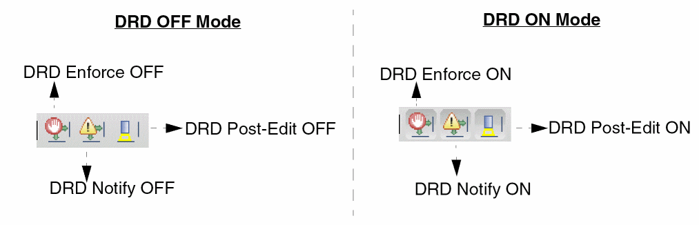 The figure below shows the icons for the three DRD editing modes in the OFF and ON states. By default, DRD editing is OFF.