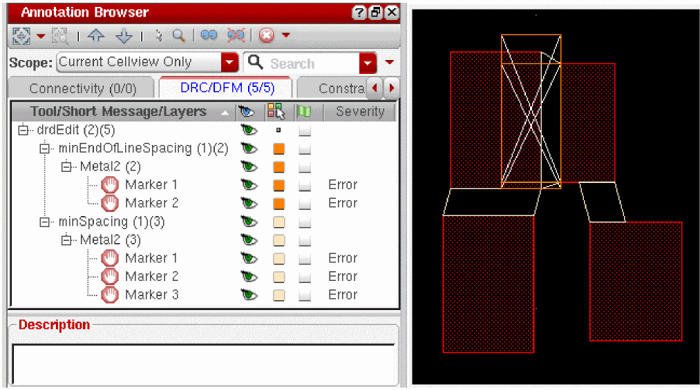 You can view, analyze, and filter the violation markers of net verification on the DRC/DFM tab of the Annotation Browser.