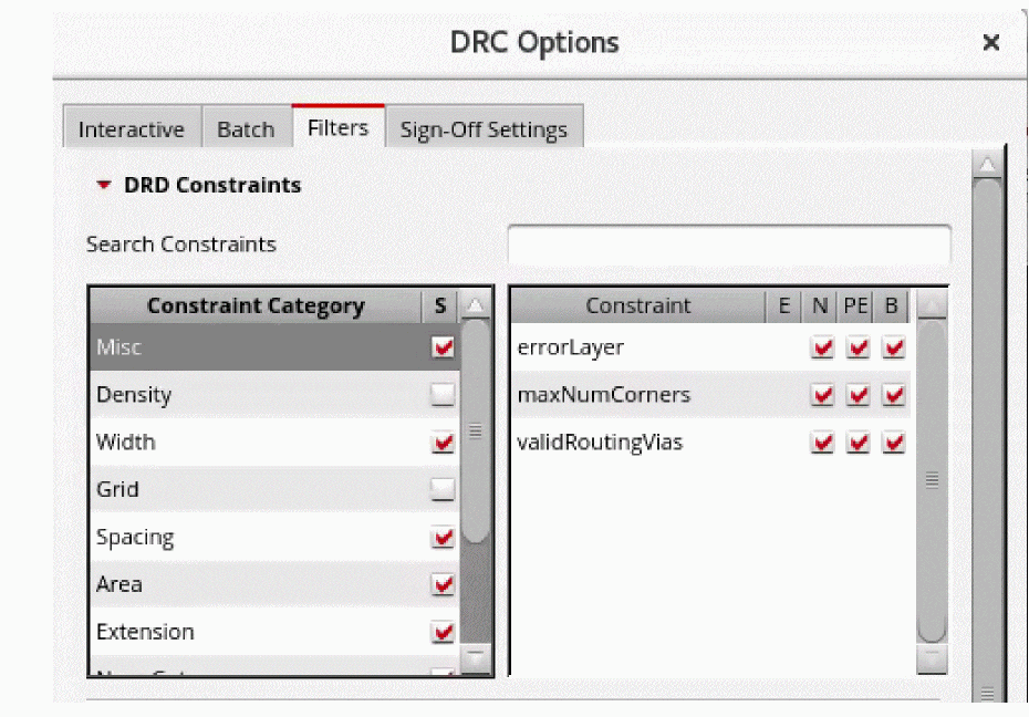 You can use the Filters tab of the DRC Options form to choose the constraints that you want to check for violations. The filter feature is available at both the constraint category and individual constraint levels.