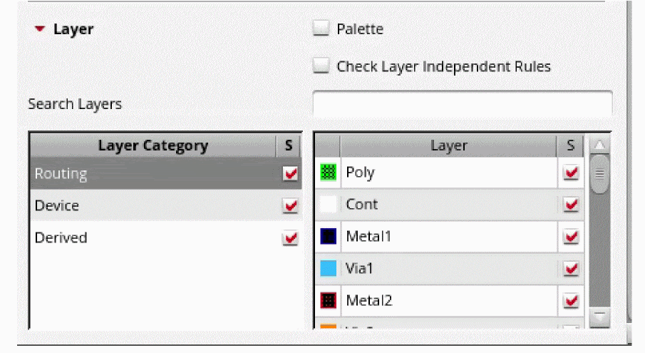 To enable or disable the checking of all the three layer categories at one go, click the S column header next to Layer Category.