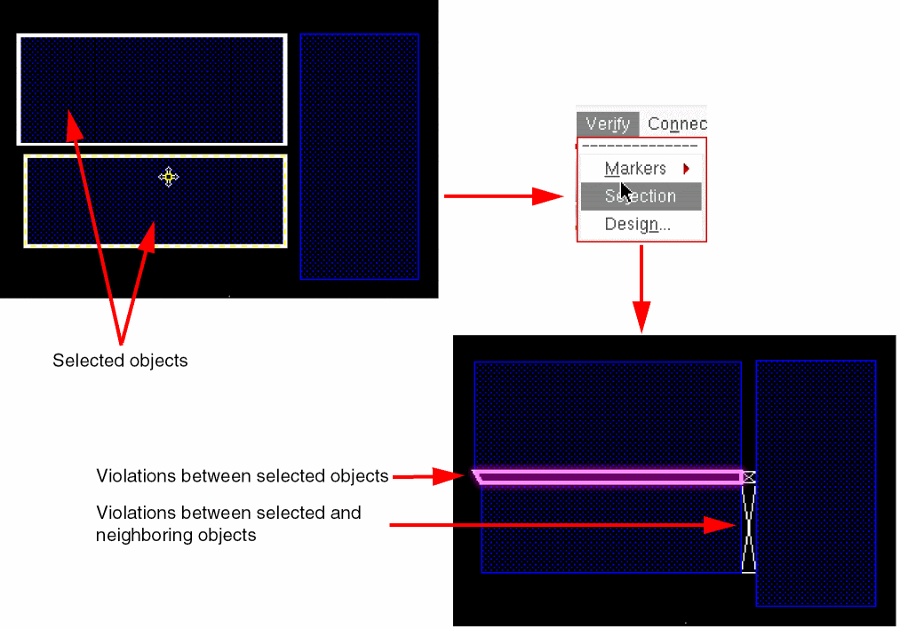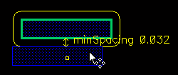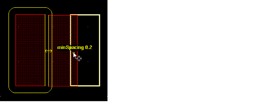 After selecting one or more objects in the layout, you can run a DRD check to verify if DRC violations exist between the selected objects and between the selected and the neighboring objects.