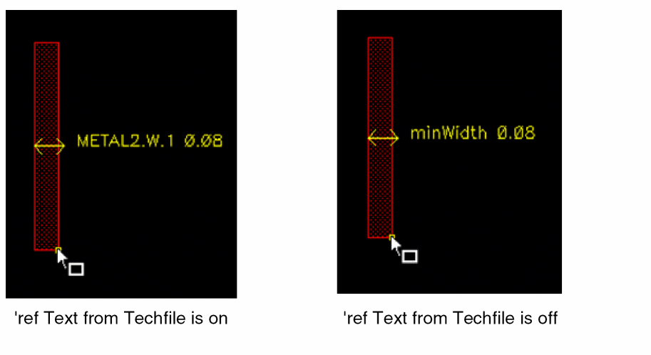 reftext for a constraint from the technology file, followed by the constraint value. This text contains the rule ID from the Design Rule Manual (DRM) of the foundry, and is, therefore, more meaningful for a layout designer. When deselected, only the name of the violated constraint is displayed, as shown below.