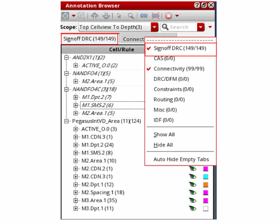 Sign-off violations are displayed in the Annotation Browser in the Signoff DRC tab of the Annotation Browser.