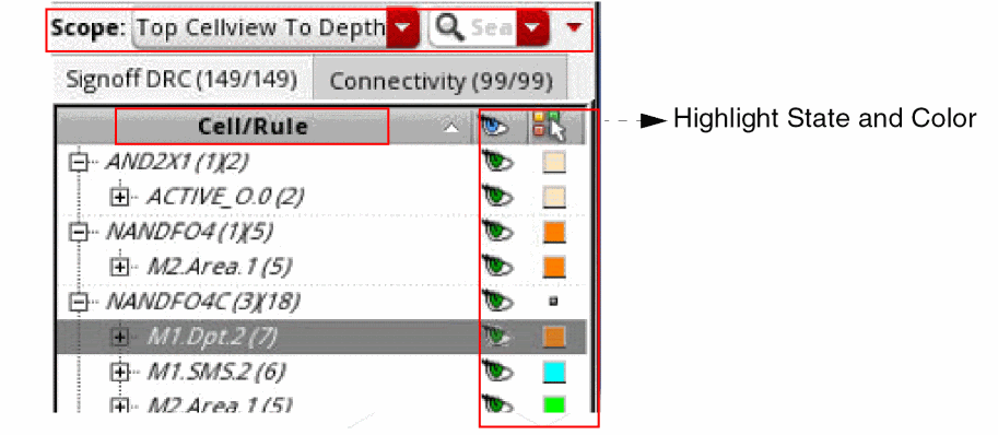 You can view the cells and their violations in the Annotation Browser. You can select the scope to display markers by selecting the options in the Scope field. You can also zoom to the selected marker. In the browser pane, you can specify the highlight state and color used to draw markers in the design.