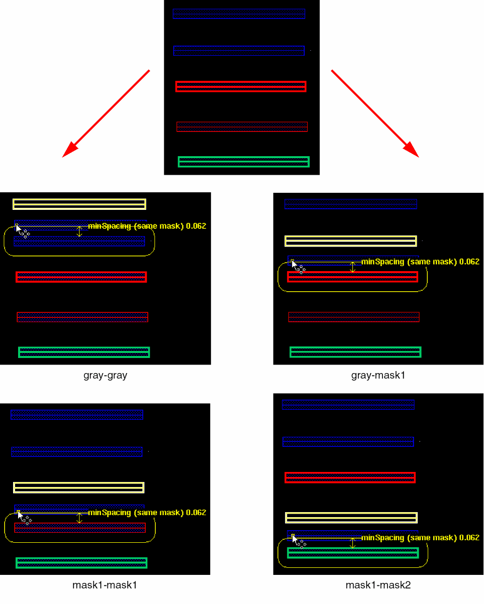 minSpacingviolations exceptsameMaskviolations. - Only: DRD reports violations only for color-related constraints.