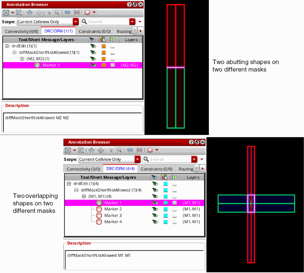 Conservative: DRD checks all color rules on all shapes irrespective of their color. For example, DRD reports same-mask violations as follows: