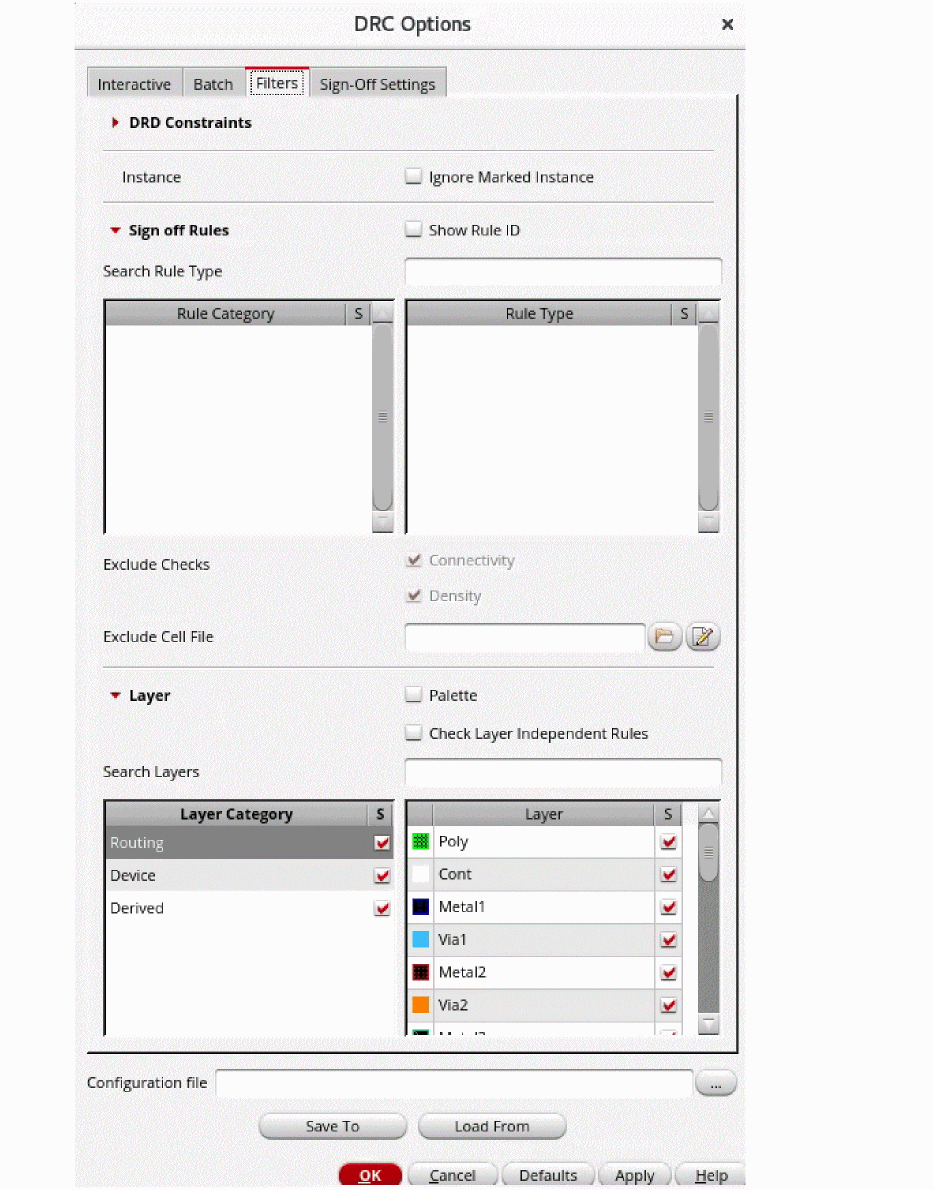 The Filters tab of the DRC Options form lets you choose the layers that you want to check for violations. When you filter the layers, only those violations that involve shapes on the selected layers are displayed. You can select the layers from the three layer categories provided, that is, Routing, Device, and Derived. The filter feature is available at both the layer category and individual layer levels.