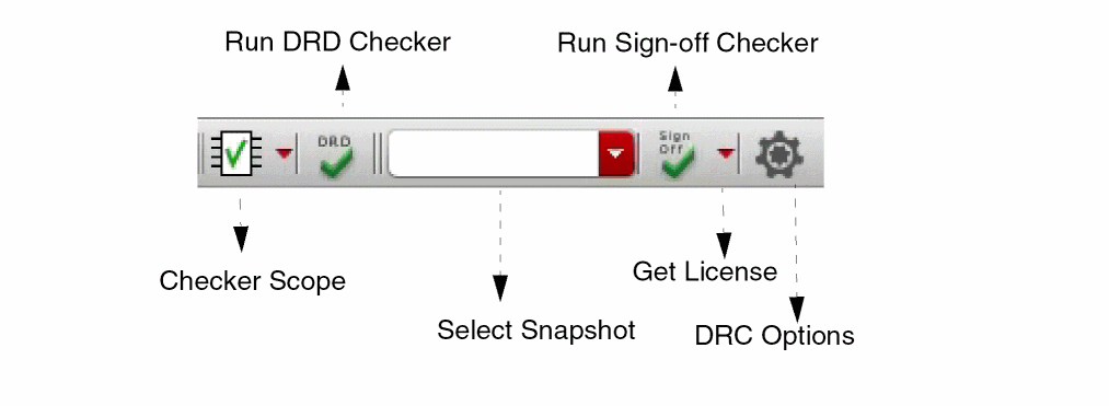 You can use the DRC toolbar to select the scope of DRC checking, to run the DRD checker, to select a snapshot to run the sign-off DRC, to run sign-off checker, and to open the DRC Options form to update the settings.