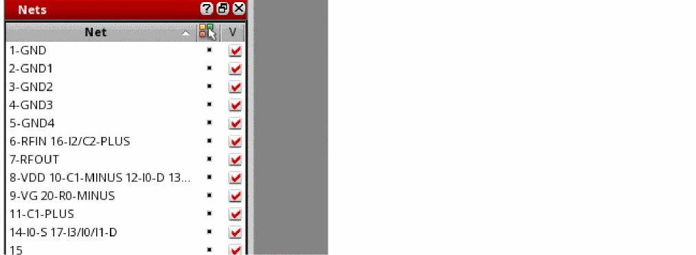 The Nets assistant displays a list of nets connected to the shapes selected for the model. Use the check box to the right of each net to control the visibility of that net and the metal islands connected to it.