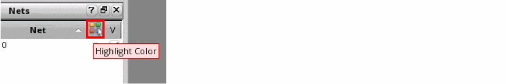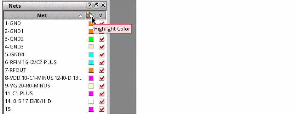 Use net color: Uses a unique color for each net and the metal island connected to it. To enable this mode, click Highlight Color in the column header.