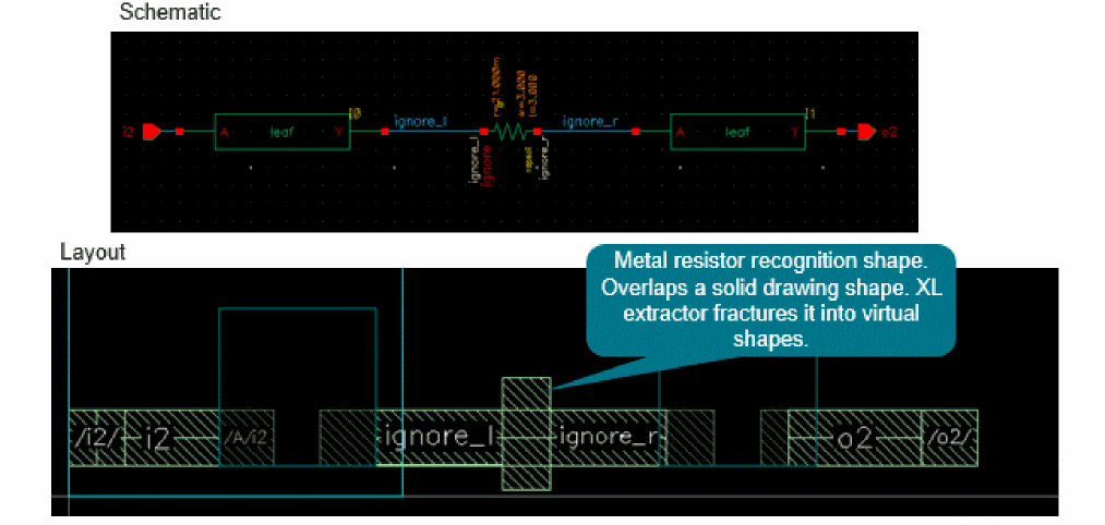 The net to which the resistor is attached is split in both the schematic and the layout views. In the example figure shown above, the resistor named ignore is placed in the schematic and the net is split into two parts, ignore_l and ignore_r. Only the schematic view contains the resistor as an instance. The layout view shows it as a virtual metal resistor recognition shape. This layer is defined as a stopping layer in the technology file. For details, see validLayers