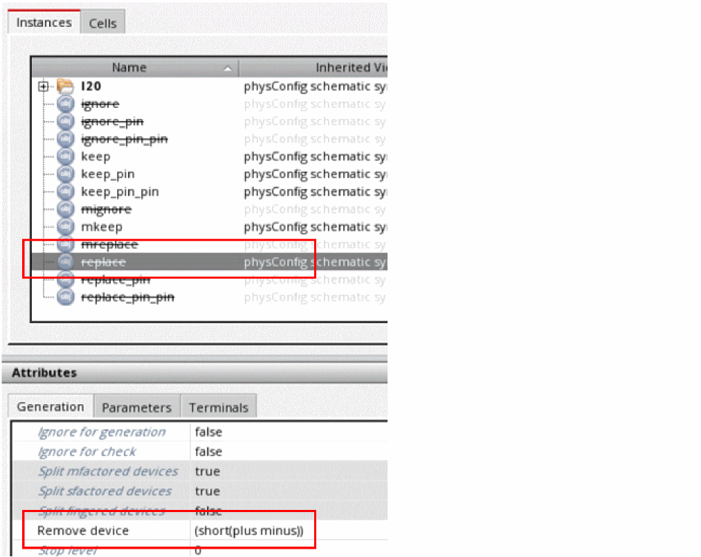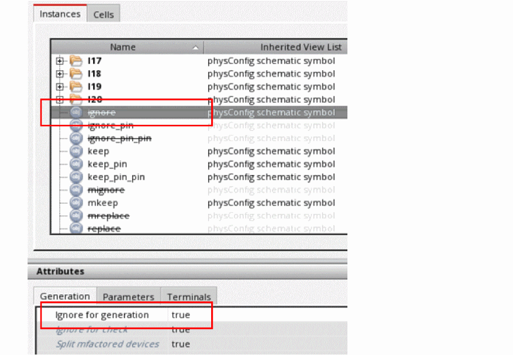 To ignore a specific instance of an LVS resistor, on the Instances tab of the Configure Physical Hierarchy window, set the Ignore for generation property for that resistor instance to