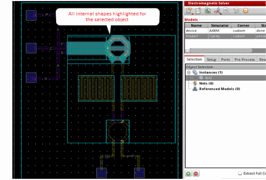 Layout MXL highlights the object and all the shapes inside it. This lets you identify the objects and shapes that would be sent to the solver.
