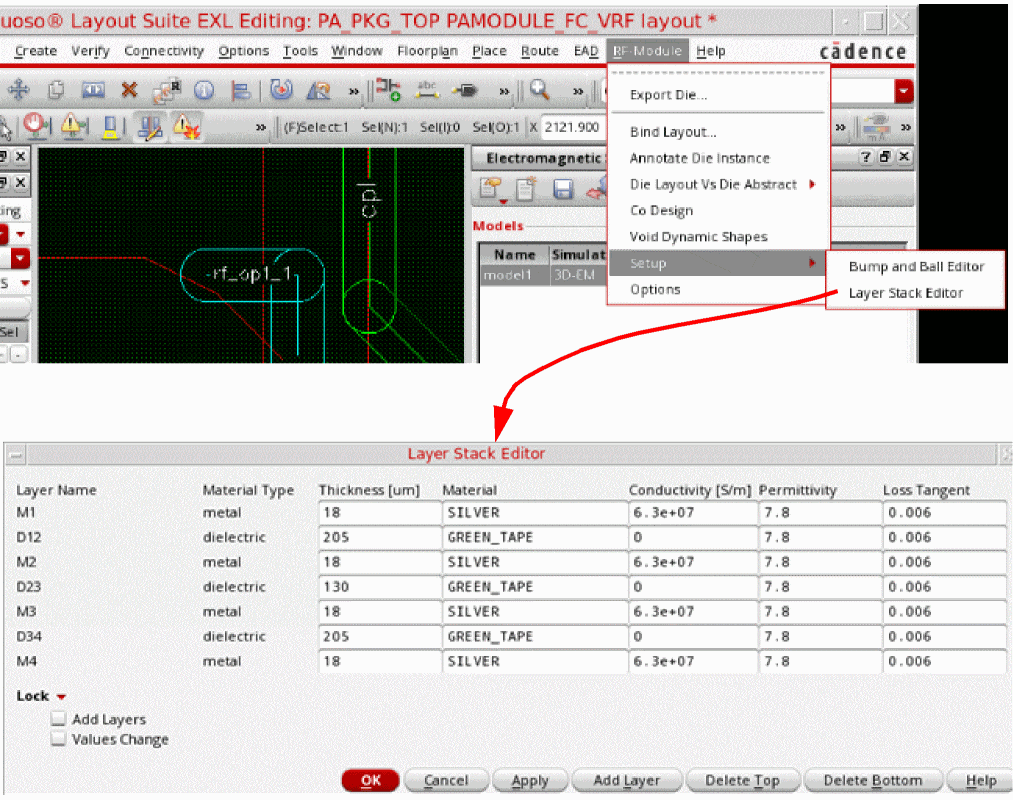 Choose RF-Module – Setup – Layer Stack Editor to open the Layer Stack Editor.