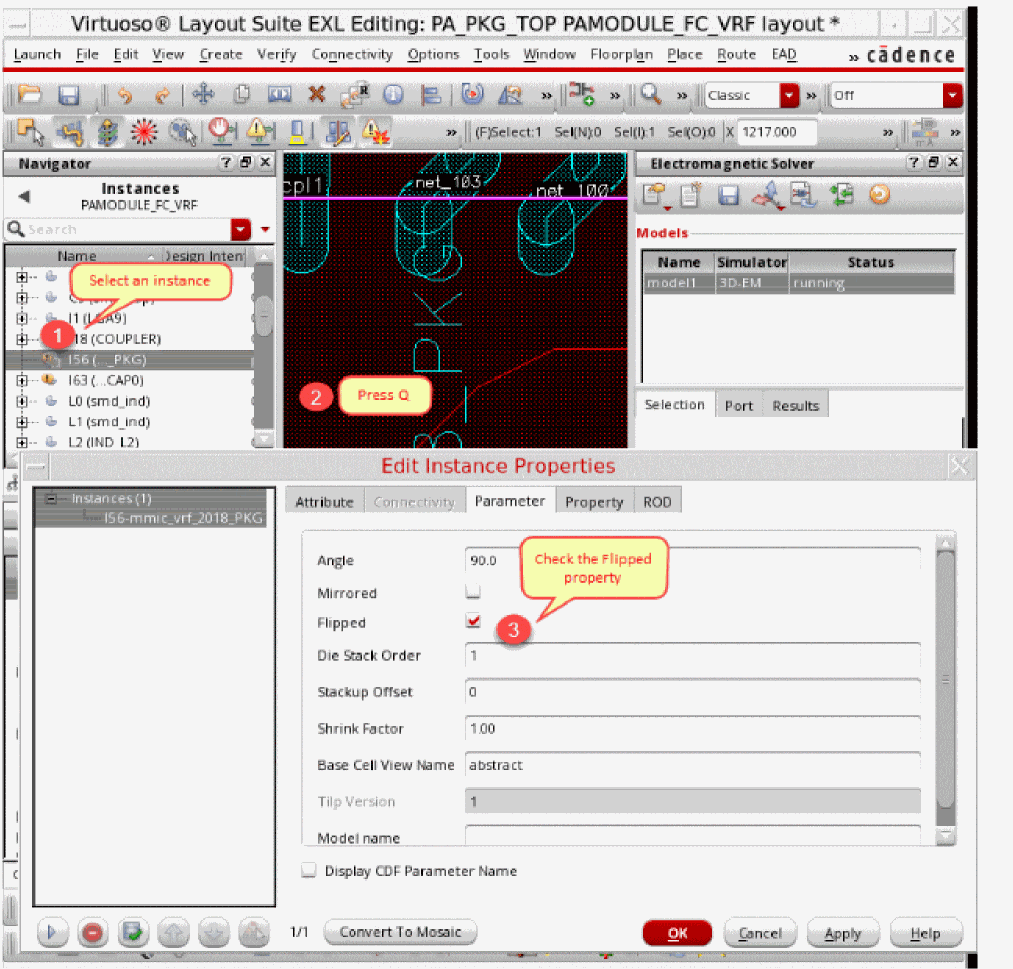 If you have a flip-chip die in the package design, ensure that it is identified correctly. For this, review the properties of the instance on the Edit Instance Parameters form and ensure that the Flipped parameter is selected.