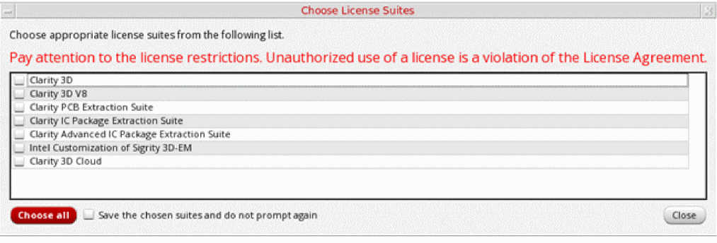To use the same license suite every time Clarity 3D Solver is launched, use the interpolationMethod shell environment variable to specify a default license suite. When this variable is set, Virtuoso looks for the specified license before launching Clarity 3D Solver. If found, it does not display the Choose License Suites form.After checking out the license, the tool does the following:- Loads the model definition and creates the layout database that is ready for simulation.
