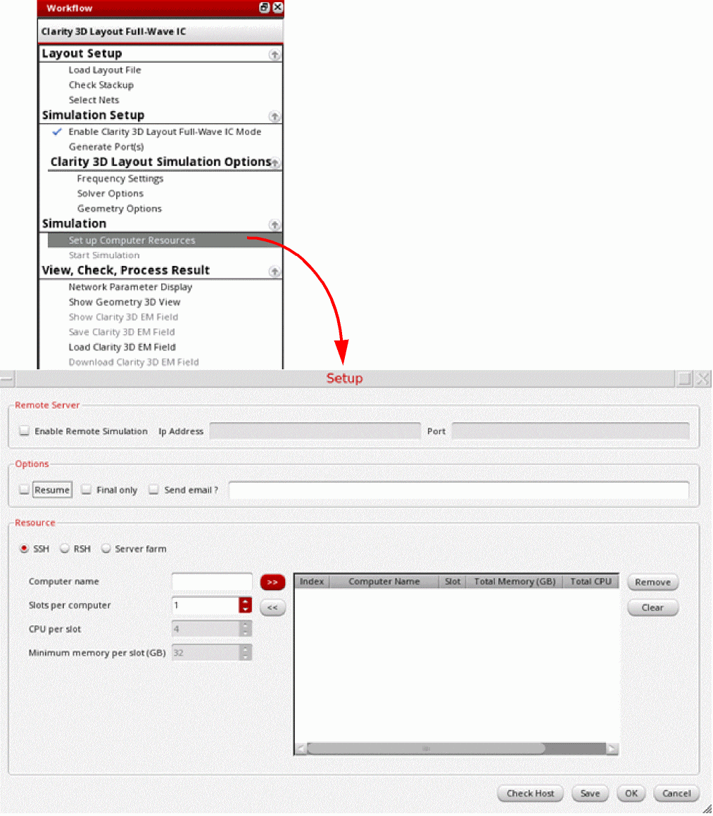 Depending on the resources you want to use for the simulation run, you can configure the settings to use a remote server farm or the localhost. However, ensure that the resource must have a minimum of 32GB memory per slot.