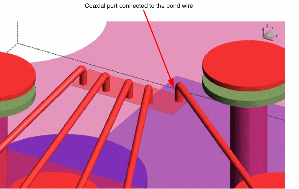 For bond wires included in models, Clarity creates a coaxial port for the net connected to the bond wire, as shown in the example given below.