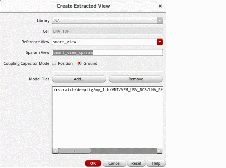 The default name used for an extracted view isemsolver_extracted. - Specify Position or Ground to stitch a coupling capacitor when one of the two nets attached to the capacitor is included in the model.