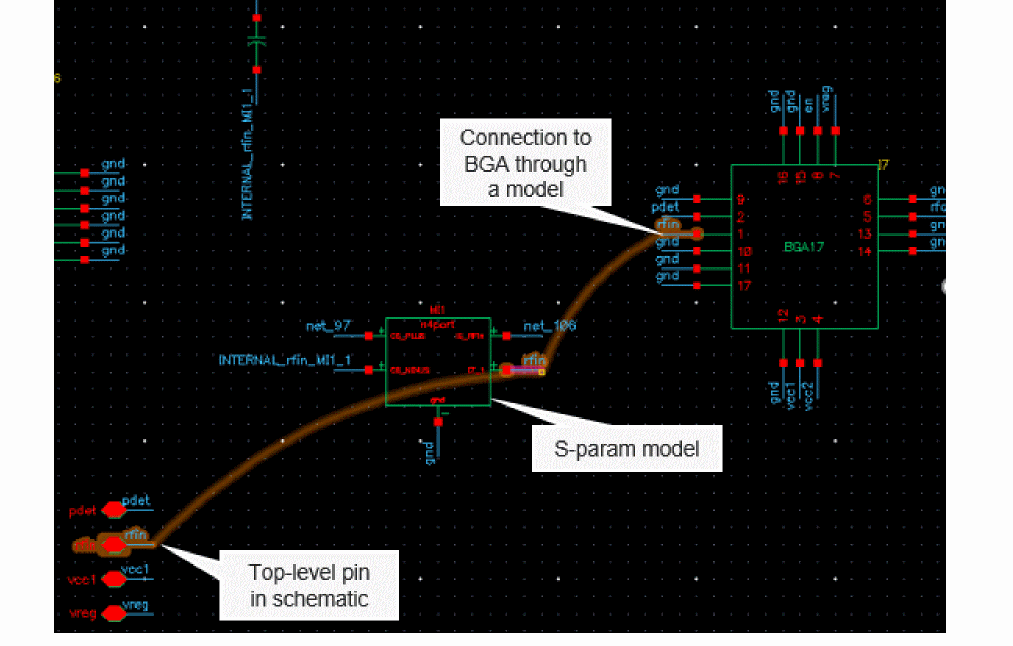 In the following example, the top-level pinrfinis connected to the package instanceBGA17through the S-param model.