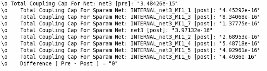 environment variable to decide how to stitch a coupled capacitor when one of the two nets attached to the capacitor is included in the model. After stitching, the tool reports the total coupling capacitance value of each net that was in the model before and after the insertion of an n-port. It also reports the difference between the two values.