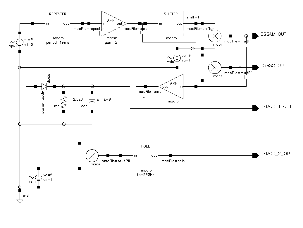 Double-Sideband Amplitude Modulation (DSB-AM) Example and illustrate the use of the functional blocks and also demonstrate that you do not have to use the blocks in isolation. Regular circuit components and components from any other installed library can be placed on a schematic and simulated.