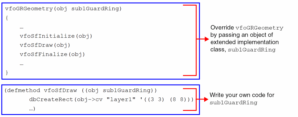 While writing code for a customized FGR device, a PDK developer extends a class from the vfoAdvGuardRing implementation class. This extended class inherits the slots from base classes and new slots can be defined in it. The examples below illustrate how to do this.