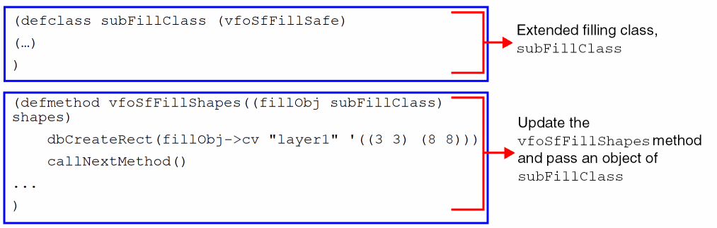 In the example below, subFillClass is the extended filling class and the vfoSfFillShapes() method is overridden to contain the custom contact filling code.