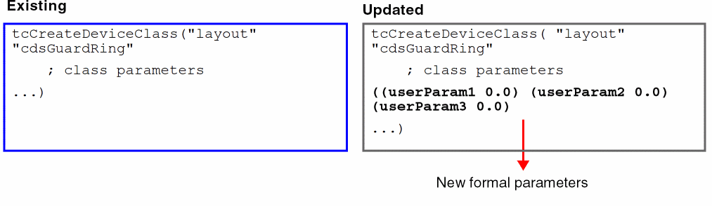 While developing a customized FGR device, the tcCreateDeviceClass class in the technology file acts as a template for device definition. Add the new formal parameters to this device class, as shown below.