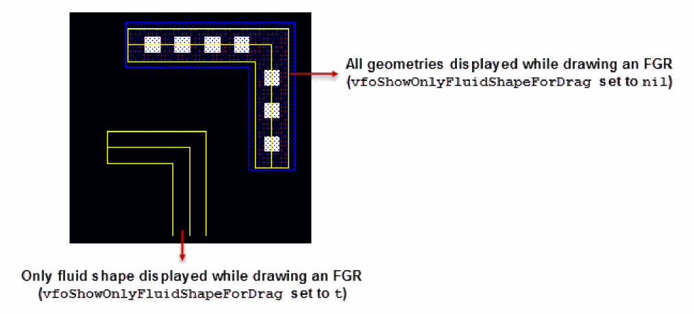 When vfoShowOnlyFluidShapeForDrag is set to nil, all geometries including the fluid shape are visible as you draw the FGR on the layout canvas. However, setting the environment variable to t displays only the fluid shape. The figure below shows the difference in the two approaches.