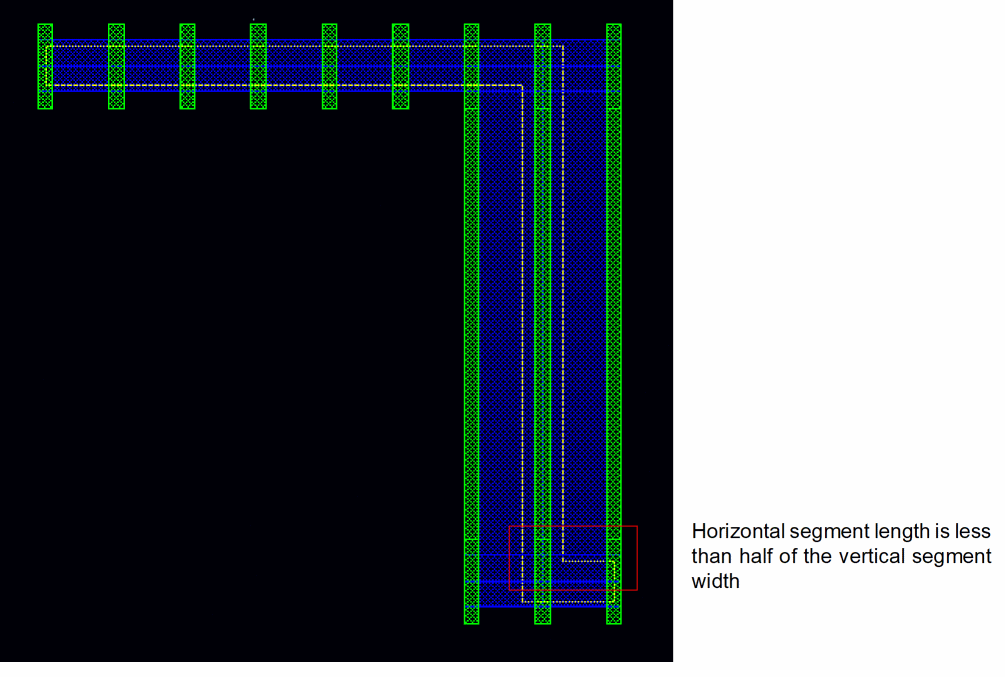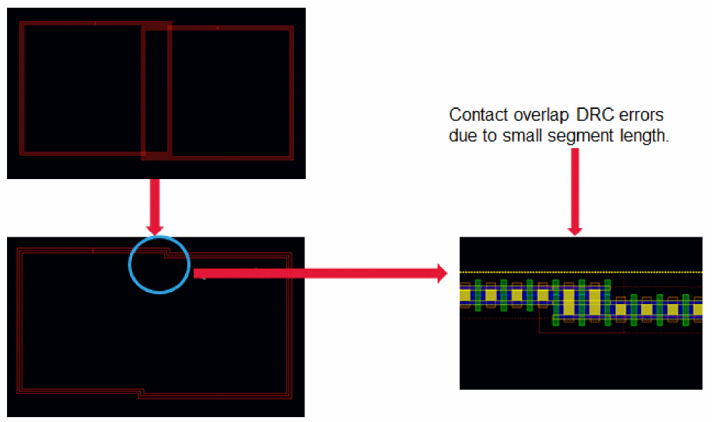 Contact overlap DRC errors are caused because of small segment length, as shown in the figure below.