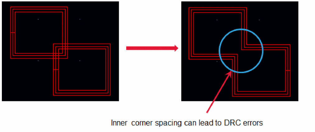 Contact overlap DRC errors are caused because of inner corner spacing, as shown in the figure below.