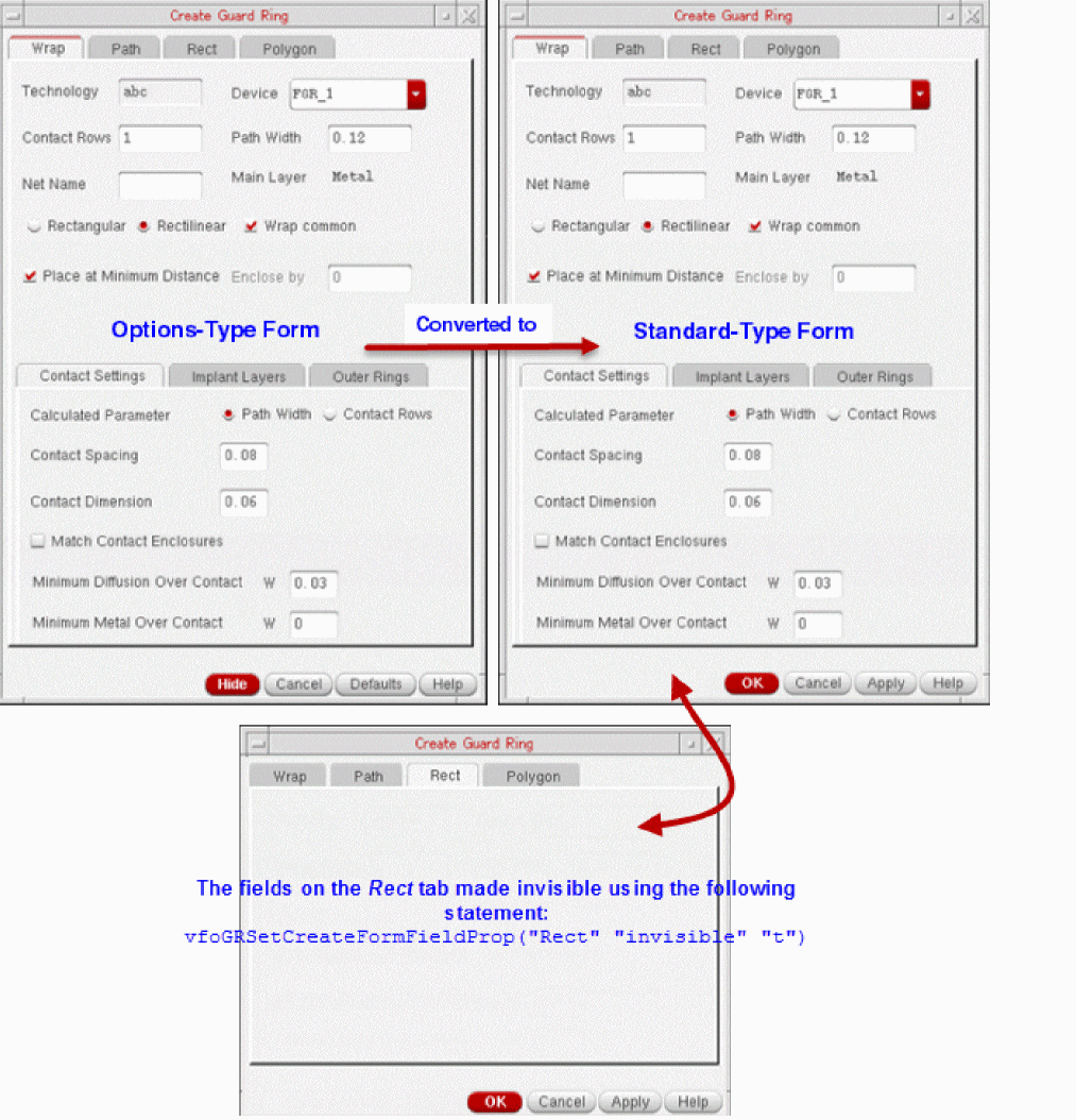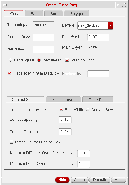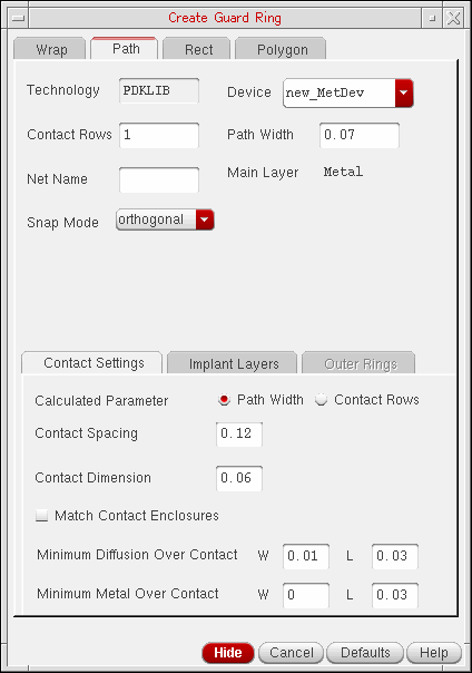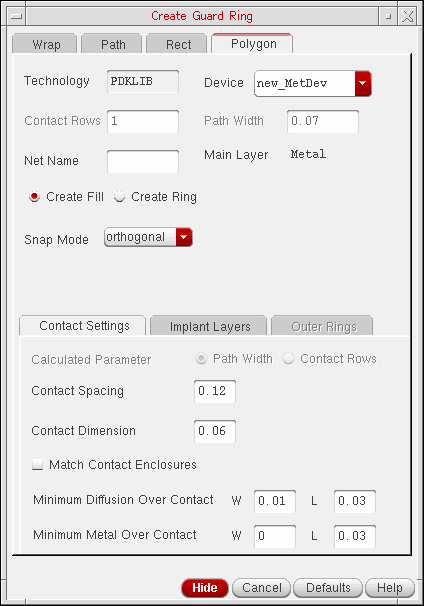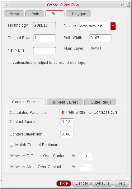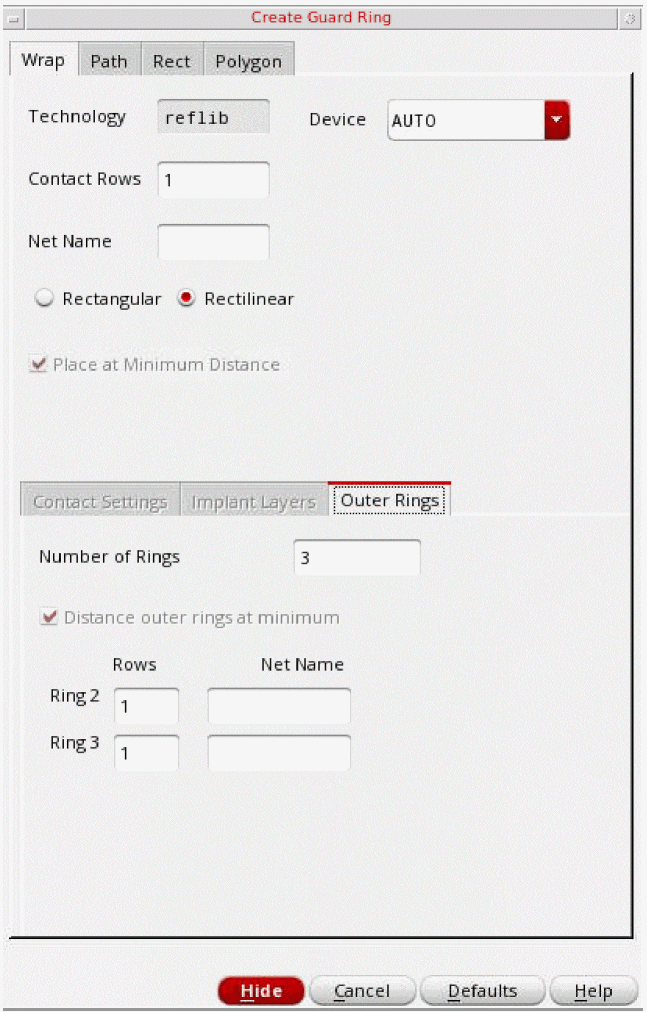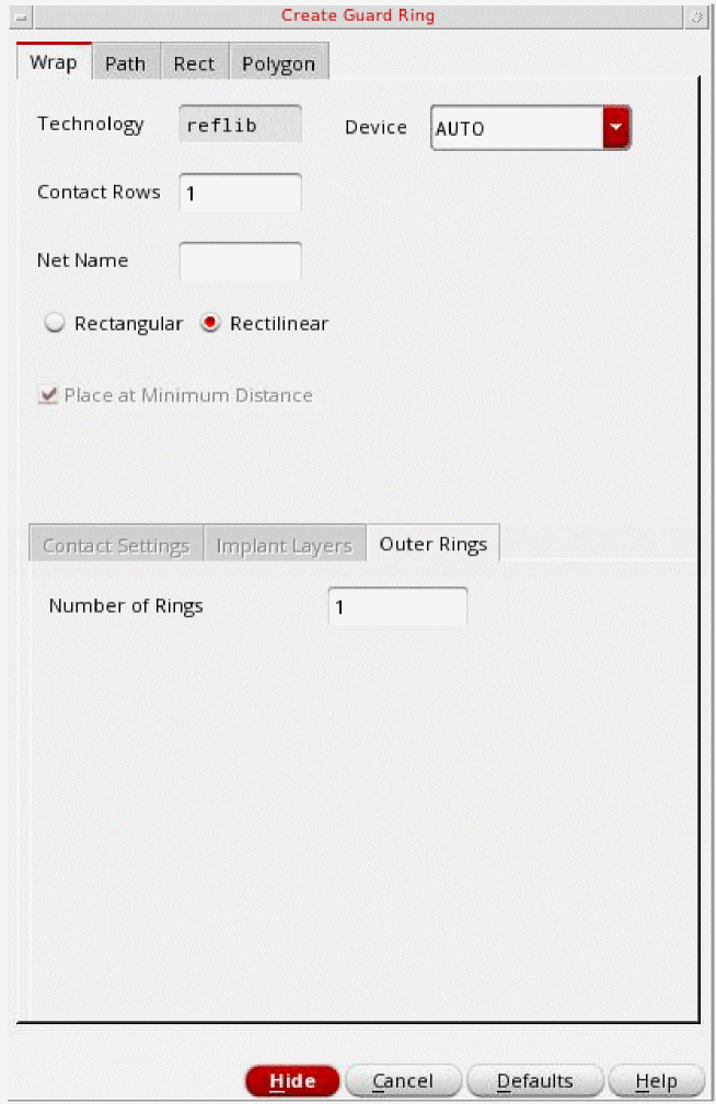 The Create Guard Ring form launched from the layout editor is an option-type form that displays the Hide, Cancel, and Defaults buttons. However, if you prefer to use a standard-type form with OK, Cancel, and Apply buttons, you have the flexibility to create such a Create Guard Ring form. The standard-type can be run from other Virtuoso applications, like Module Generator (Modgen) and Constraint Manager.