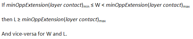 In this context, you can consider 0.02 as the minimum value and 0.05 as the maximum value. So, the W and L text boxes adjacent to the Minimum Diffusion Over Contact and Minimum Metal Over Contact fields can have either of these two values. If W has a value equal to or greater than the minimum value, but less than the maximum value, L should have a value greater than or equal to the maximum value, or vice versa. The following equation illustrates this effect of the minOppExtension technology rule on W and L values: