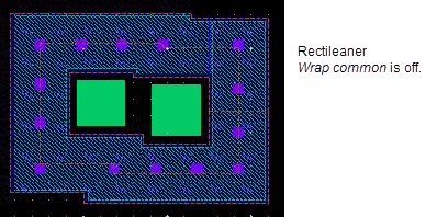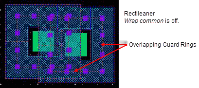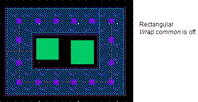 In this mode, an FGR is created around the objects you select. The selection of the Place at Minimum Distance check box on the Wrap tab of the Create Guard Ring form identifies whether the minSpacing rule defined for the object layers, which include both original and derived layers, should be used to compute the spacing between the FGR and the object.