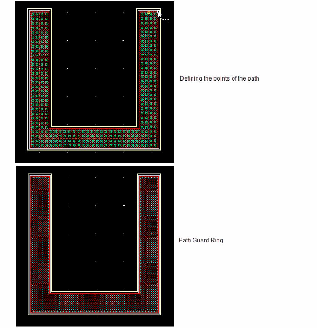 You can create FGRs by either drawing one of the following: path, rectangle, or polygon, or by using the wrap mode. Each of these different modes are represented by a tab on the Create Guard Ring Form (Old GUI). You can also create FGRs as concentric rings. During FGR creation, you can specify the method for distributing contacts over the created FGR.