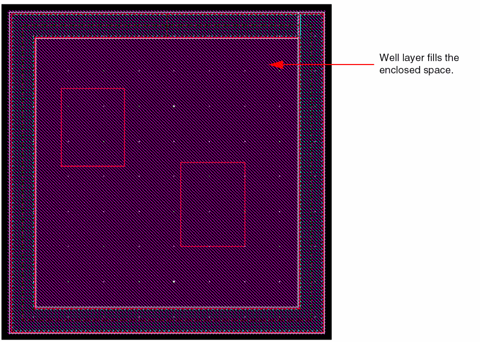If you installed the FGR device with the Cover Interiors check box selected for the Implant/Well layer (Layers section), the rectangular FGR enclosure is filled with the implant or well layer, as shown below.