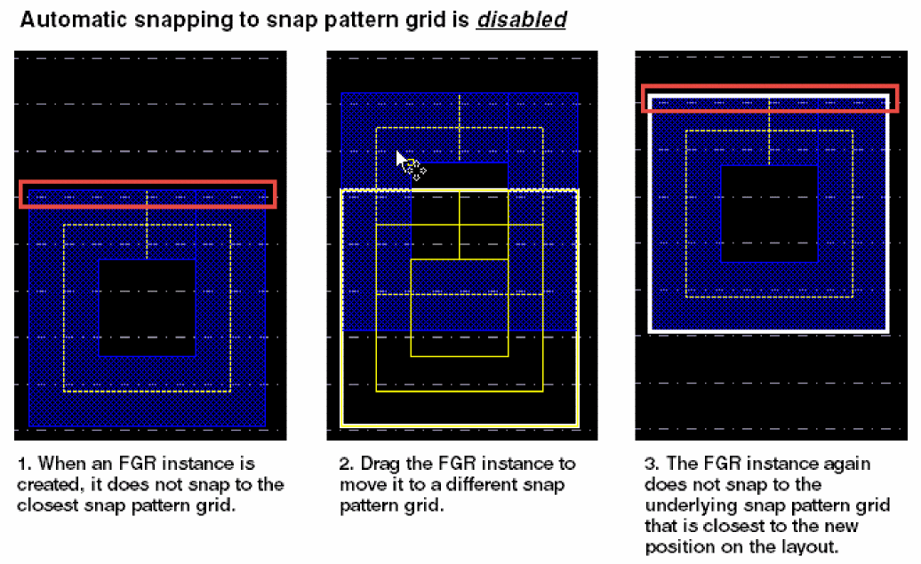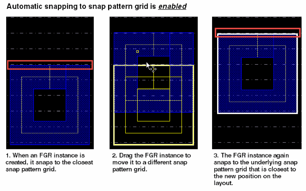 When you create an FGR for a FinFET device, the FGR instance automatically snaps to the underlying snap pattern grids if the Snap Pattern Snapping check box is selected in the